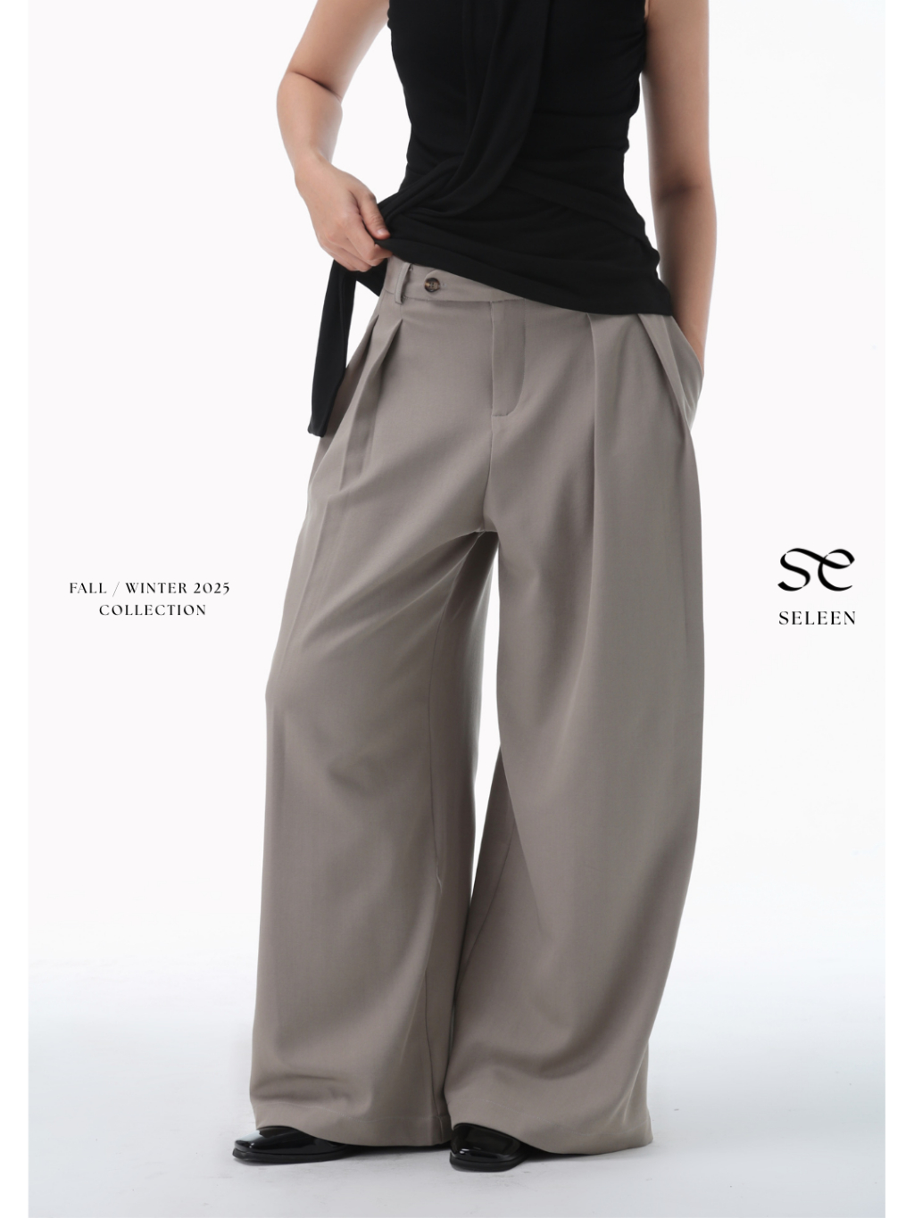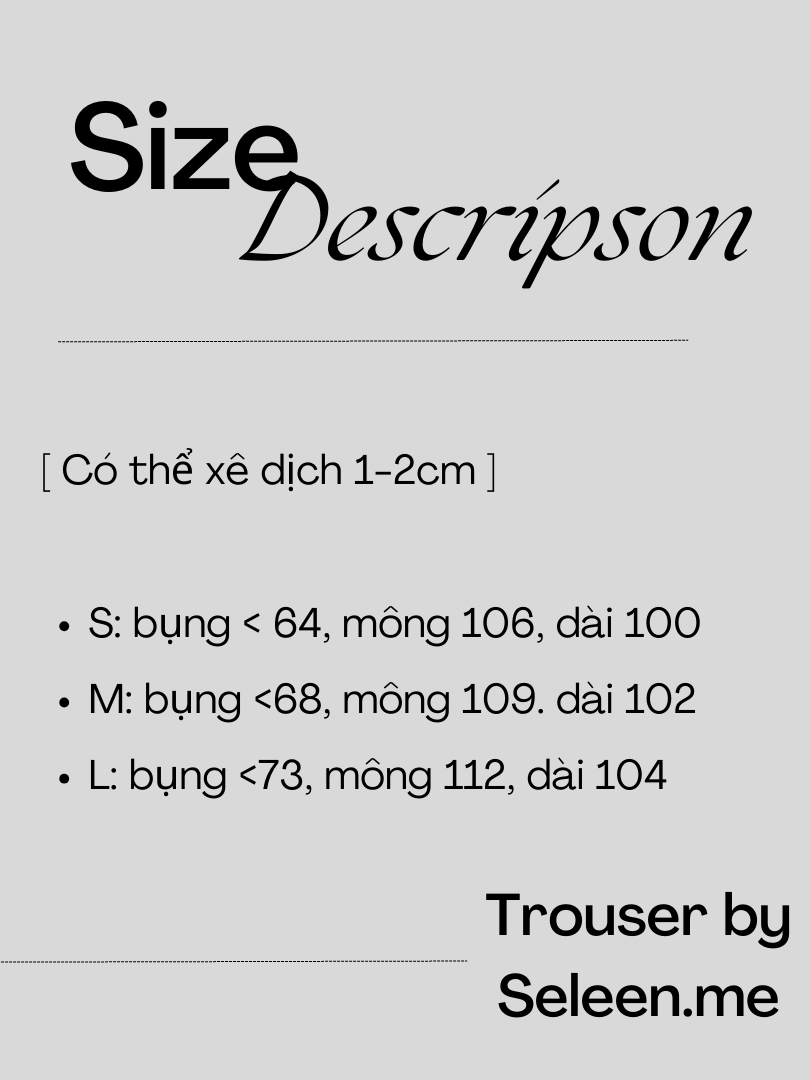 Seleen, Quần tây lưng cao ống rộng chi tiết chút cài ngang, WB0178 1. Thông tin sản phẩm: - Chất liệu: Bố Ruby - Form: quần dài, lưng cao ống rộng - Màu: Beige 2. Kích thước: [ Có thể xê dịch 1-2cm ] - S: bụng < 64, mông 106, dài 100 - M: bụng <68, mông 109. dài 102 - L: bụng <73, mông 112, dài 104 3. Chính sách đổi trả: - Đối với sản phẩm lỗi do nhà sản xuất: Seleen.me nhận đổi trả những sản phẩm bị lỗi sản xuất trong vòng 3 ngày kể từ lúc nhận hàng (Nguyên tem mắc, chưa giặt, chưa qua sử dụng). Seleen thanh toán phí ship 2 chiều ạ. - Đối với sản phẩm đổi size, mẫu: Seleen hỗ trợ nếu khách hàng muốn đổi nếu cảm thấy màu/mẫu sản phẩm không phù hợp (đổi sang sản phẩm cùng giá hoặc cao hơn). Khách thanh toán phí ship 2 chiều giúp seleen ạ. Lưu ý: Mỗi đơn hàng chỉ đổi trả 1 lần.